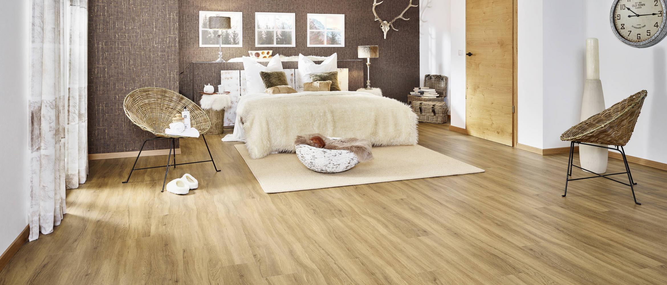 Auf der Grundschicht aus Kunststoff liegt das Dekorpapier und darüber die transparente Nutzschicht. Diese ist die Basis für die Klassifizierung in die entsprechenden Einsatzbereiche. Zur Wahl stehen eine Vielzahl von Holz- und auch Fliesenoptiken.